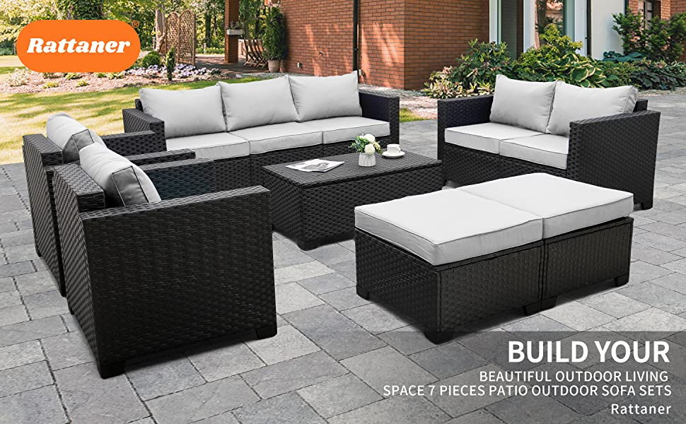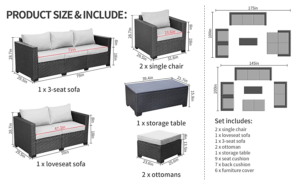 HIGHLY ADAPTABLE: Patio conversation set includes armchairs, loveseat, couch, ottomans, and storage table, styles coverage are diverse and unique. Depending on needs and better space utilization, various layouts and combinations are suitable for any decorative fashion and scene, indoors or outdoors. The table with storage allows storing multiple items for easy access anytime, is superbly convenient, greatly enriches your outdoor life.