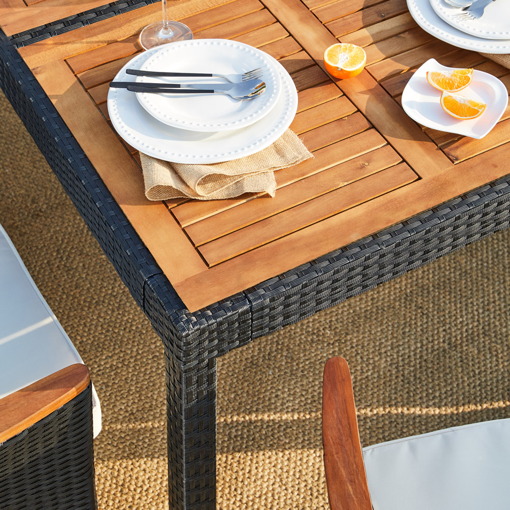 Le salon de jardin est équipé d'un plateau de table ainsi que d'accoudoirs en bois d'acacia massif, résistant et dotés d'un grain de bois naturel. Par ailleurs, la table et les chaises sont équipées de pieds réglables en hauteur pratiques.