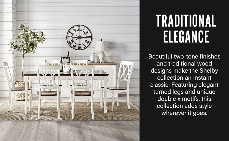 Ideal for an eat-in kitchen or dining room, the Shelby 7-Piece Dining Set was designed with tradition in mind. Featuring an 18" drop leaf and classic turned legs, the dining table can expand to accommodate up to six diners. The open double x-back chairs provide comfortable seating, making the Shelby 7-Piece Round Dining Set the perfect spot for a family meal.