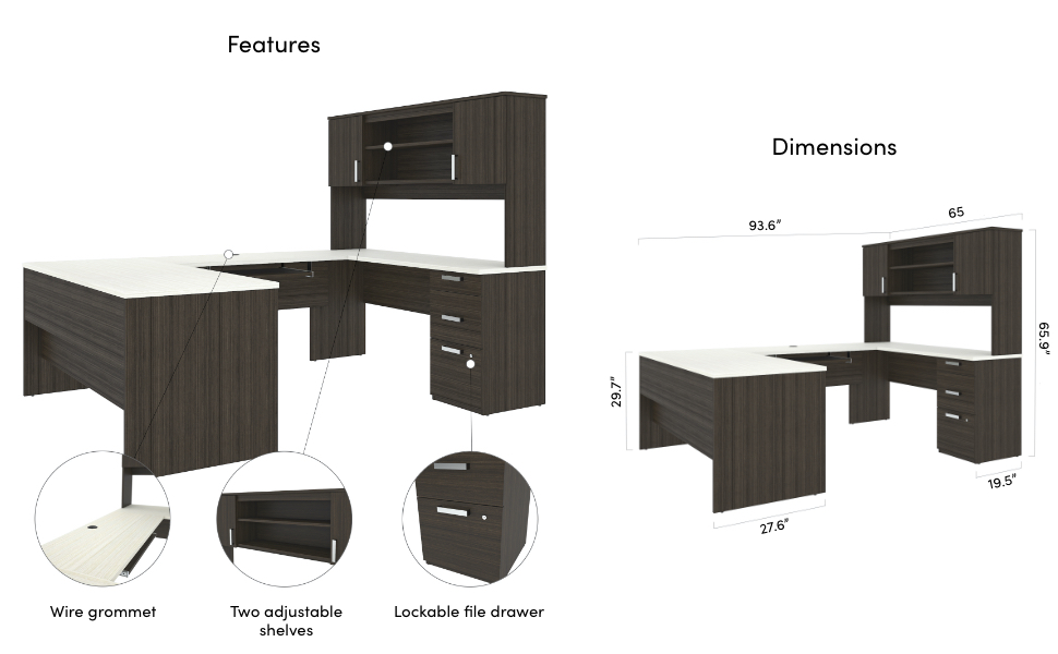 • NOTE: 2 people are required for assembly. 65” W X 65.9” H X 93.6” D for the desk and hutch. The unit is fully reversible. 1 grommet on the bridge for cable management.