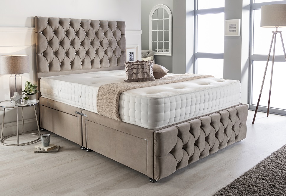 【Furniture】Pebble Plush Velvet Chesterfield 2 Drawer Divan Bed Set, Mattress & Headboard