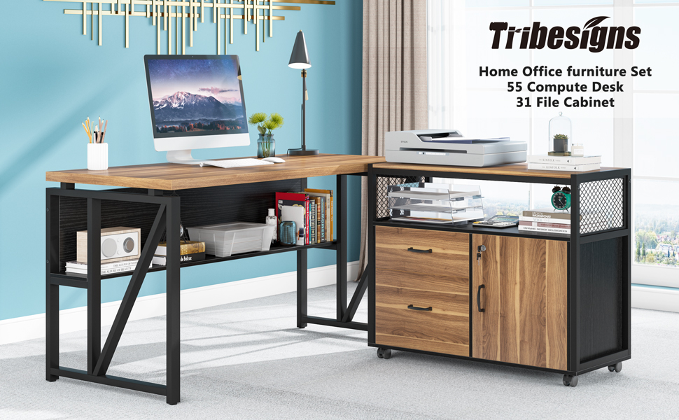 【Furniture】L Shaped Desk with Drawer Cabinet, 55" Executive Computer Desk and lateral File Cabinet