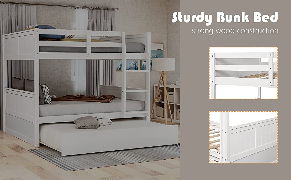 Full Bunk Bed with Twin Trundle: Features two full bed and a twin size pull-out trundle bed for overnight guest,maximize the usage of your space. Perfect if you are tight on space.