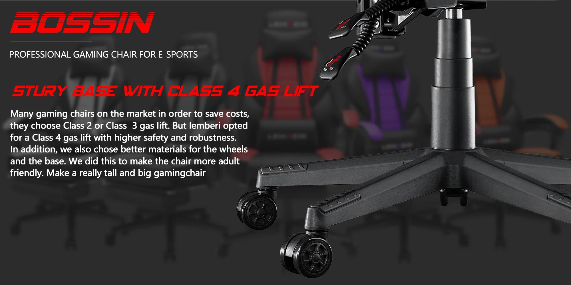 The Bossin gaming chair is designed for your every need! The gaming chair matches all locations. 360° Swivel and smooth racing caster wheels for mobility; 90°-180° reclining for working, gaming, reading, or napping; retractable footrest for relaxing; adjustable seat height, 400 lbs. capacity; head pillow and lumbar pillow for all body shapes. The winged back provides multi-point body contact to share the pressure and save your spine and lumbar with ergonomic back and massage support. Lean your legs more comfortably with a bucket seat design. The side wing frame has been thinned and contains a more soft filling. Alloy frame covered in quality PU leather and 6 inches of high-density foam for comfort. It is stable enough to serve for years.