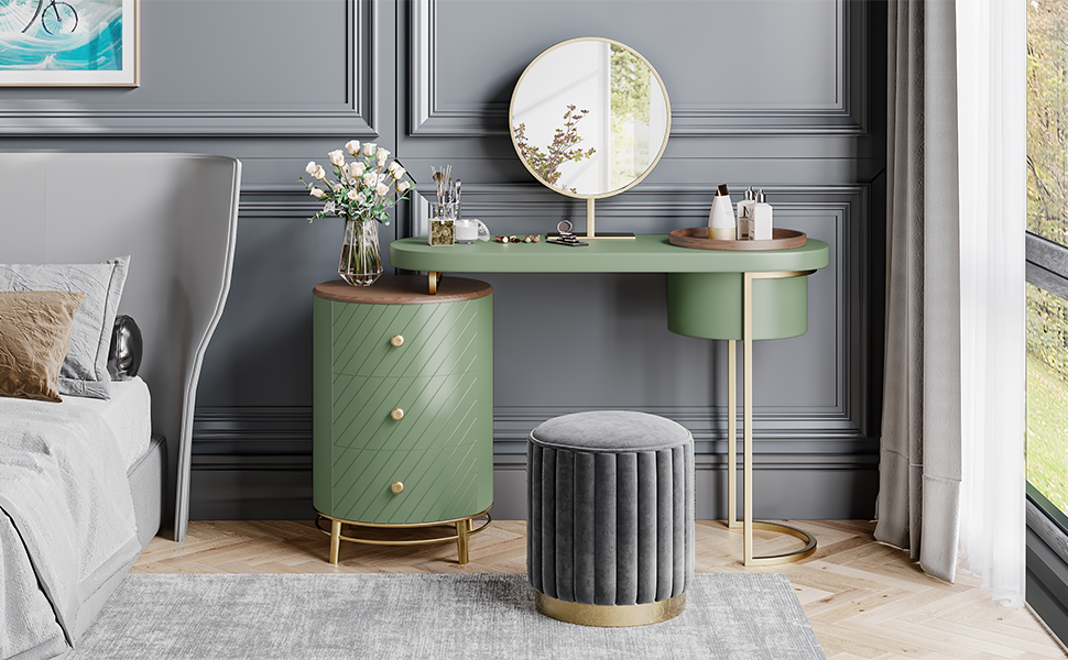 【Large Storage Space】The 3 drawers of the side cabinet and a hidden compartment with a movable tray top offer capacious storage for your makeup and skin-care necessities.