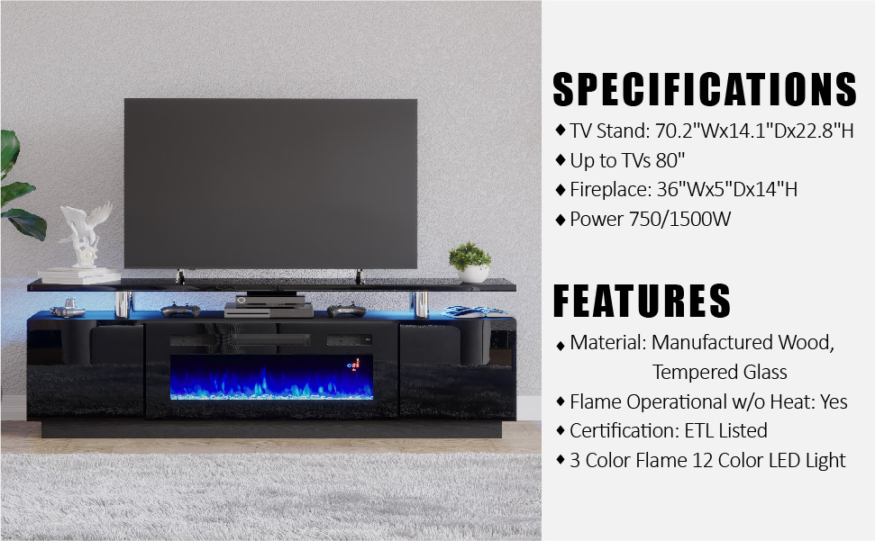 • TV Cabinet Dimension: 70.2"W x 14.1"D x 22.8"H. 70 inch television stand for flat or curved screen TV up to 80". Max weight capacity 250lb. Fireplace Dimension: 36"W x 5" D x 14"H, can work with or without heat.
