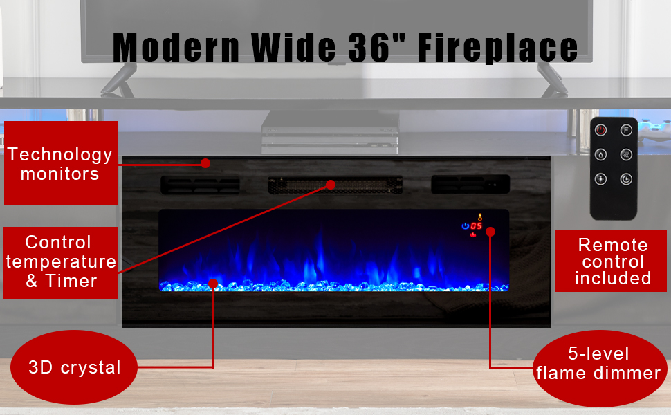 • 36" wide modern electric fireplace features 3 color realistic flame&5 level brightness,temperature control and time setting.750W/1500W Power heats quicker & energy efficient for max 4800 BTU output.Remote control included.
