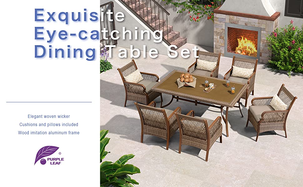 Set Includes and Assembly: This outdoor dining set contains 1 rectangle table, 6 dining chairs, 6 pillows and 6 cushions. All hardwares, tools and instructions are included for your convenience and quickly assemble.