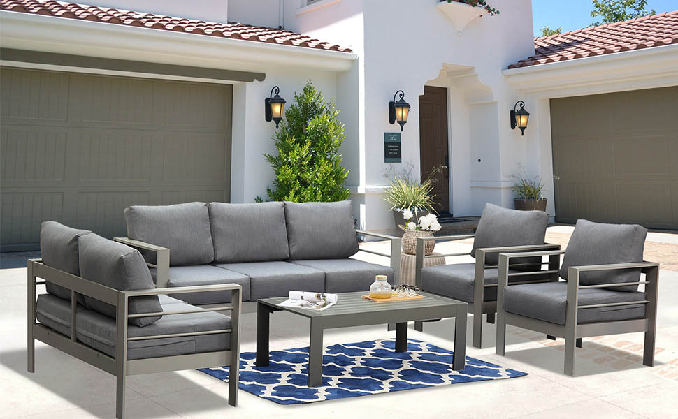 UPGRADED ALL-ALUMINUM FRAME: Our modern patio furniture is crafted with upgraded all-aluminum, which is different from iron sofas on the market. Aluminum was once known as the aristocracy of metals because of its unique properties. The surface of aluminum will naturally form an oxide layer and can protect itself from rusting, fading, and corroding in all kinds of weather.